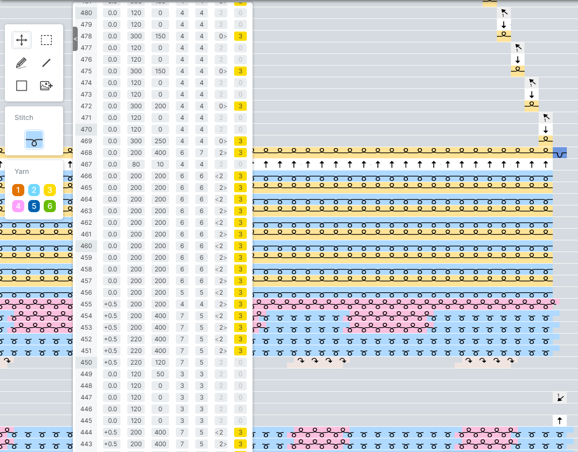 This is where I go back into the Kniterate design app and program the stitches into shaped pieces for the garment in the correct size this time. The swatches I knitted earlier act as gauge swatches.